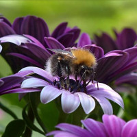 Картинка показывает шмеля (тип пчелы), сидящего на вершине некоторых фиолетовых цветов. Цветы имеют зеленые листья и, по-видимому, находятся в естественной обстановке, возможно, в саду или на лугу.