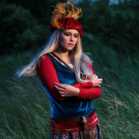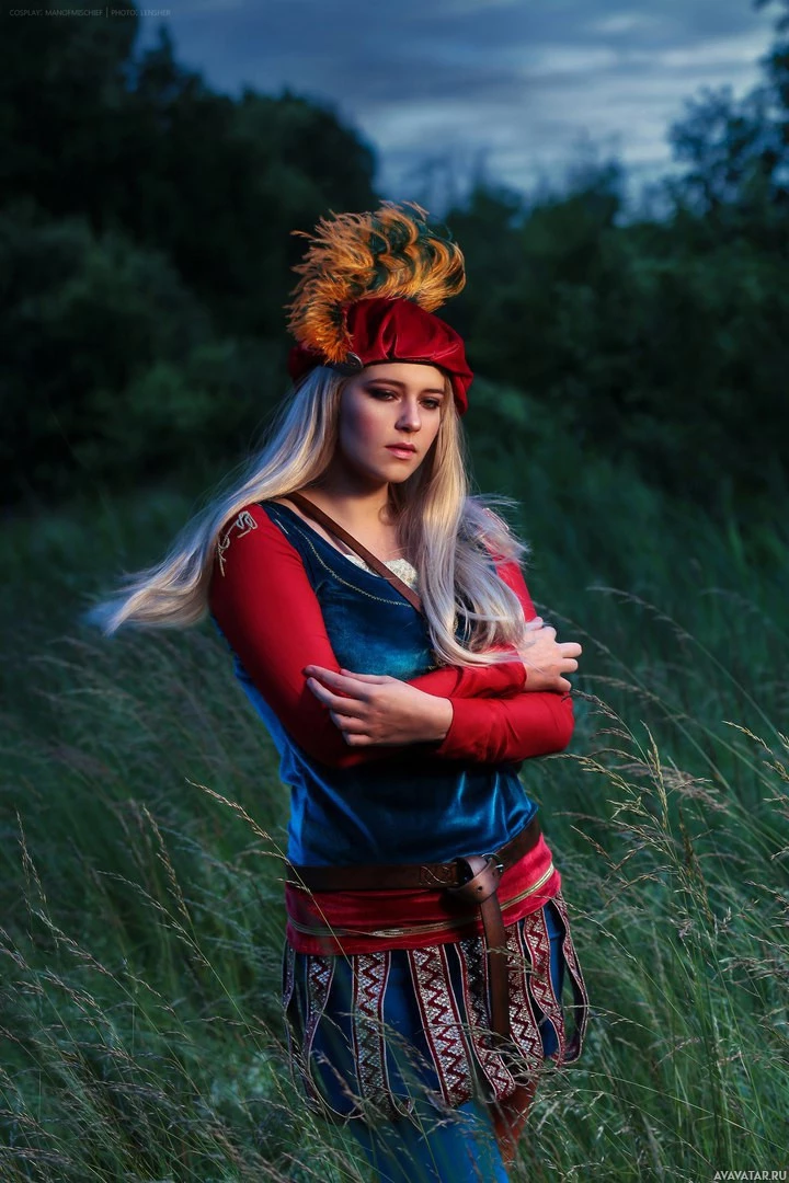 The image shows a person dressed in a costume that appears to be inspired by the game "The Witcher." The individual is wearing an elaborate headdress with feathers, and their outfit includes elements such as armor pieces with