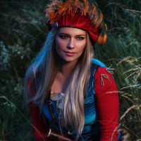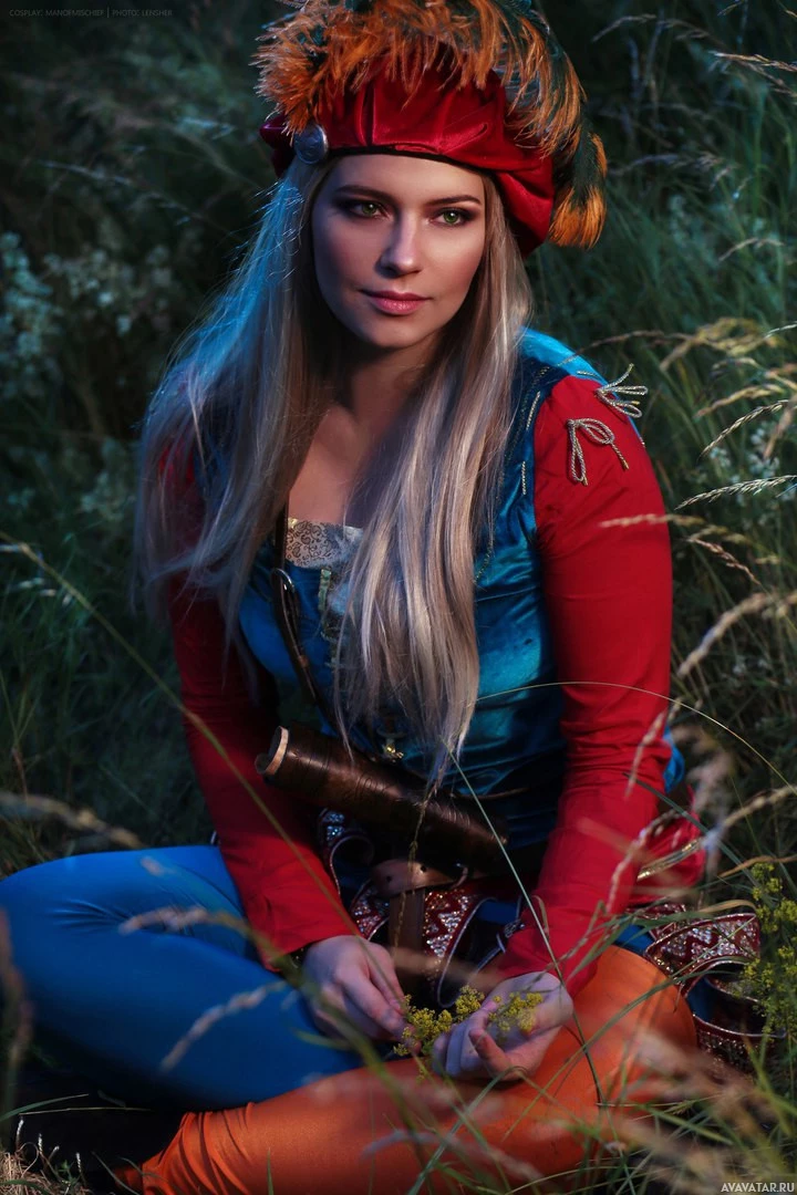 In the image, there is a woman dressed in costume that appears to be inspired by characters from "The Witcher"