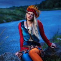 face paint or makeup that complements the costume, adding to the character's authenticity in appearance. The setting appears to be a natural