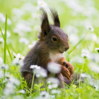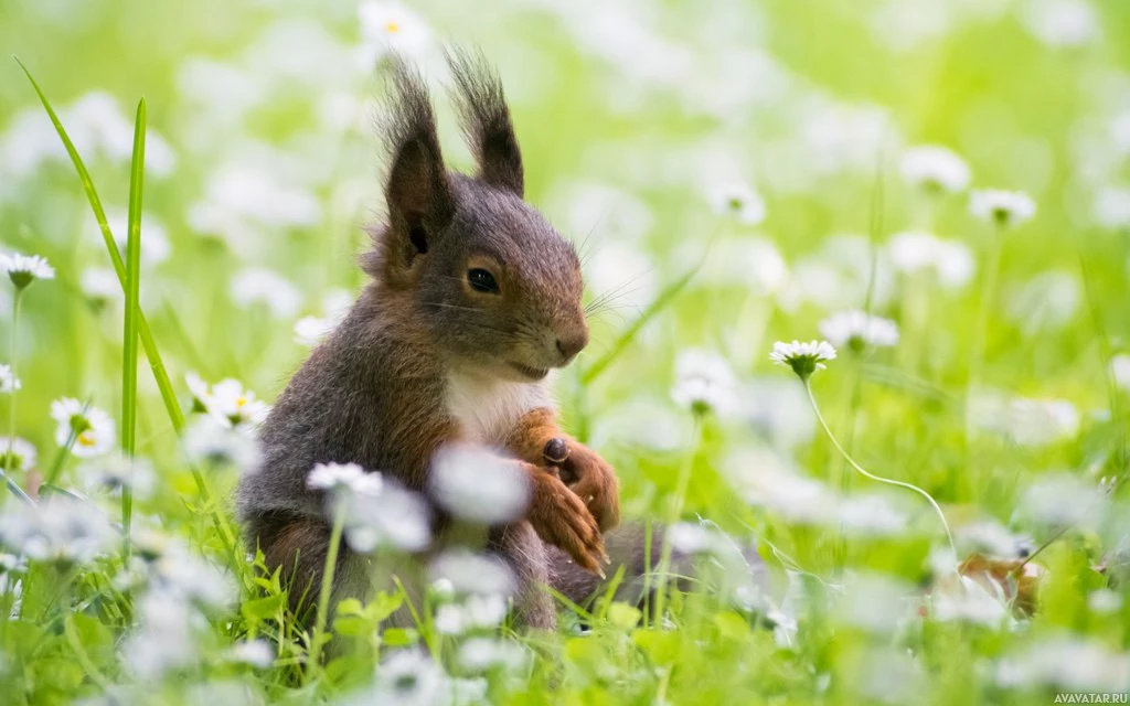 red squirrel sitting in the grass among white flowers. It appears to be resting or observing its surroundings, and it's nestled among fluffy