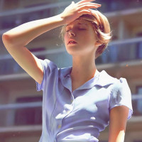 a high waist. Her eyes are closed, which adds to the overall