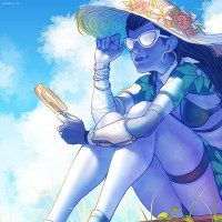 a straw hat with flowers around it, which adds a casual and relaxed vibe to the scene. The character is wearing a floral print outfit that could be described as