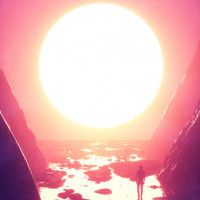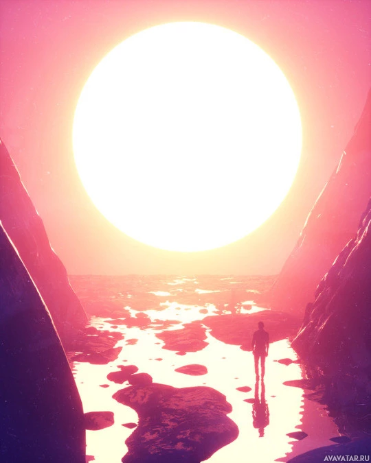 lone figure can be seen walking towards the light source, which adds a sense of scale and solitude to the scene. The colors are predominantly pinkish-orange near the sun and transition into cooler shades as they reach the ground. This image is often associated with themes of journeying towards enlightenment or the unknown.