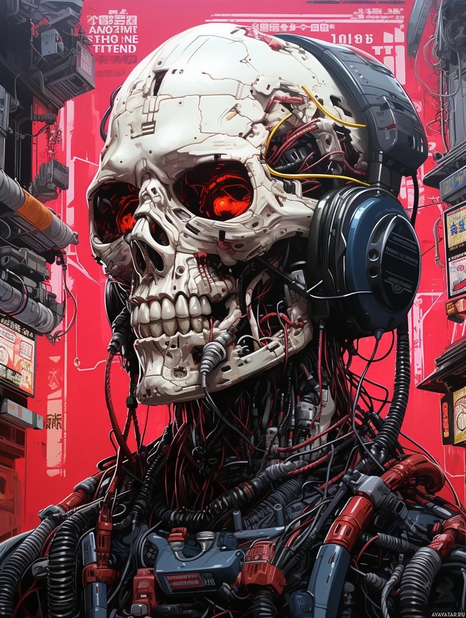 science fiction. This character is wearing headphones and appears to be connected by wires to some sort of machinery or equipment in the background, which suggests a high-