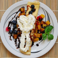 whipped cream and sliced blueberries. There appears to be a drizzle of