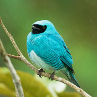The image shows a blue bird, possibly a Blue Jay or a similar species, perched on a branch. It appears to be in the midst of rain, as evidenced by the raindrops visible on the leaves and the wet surface of the vegetation.