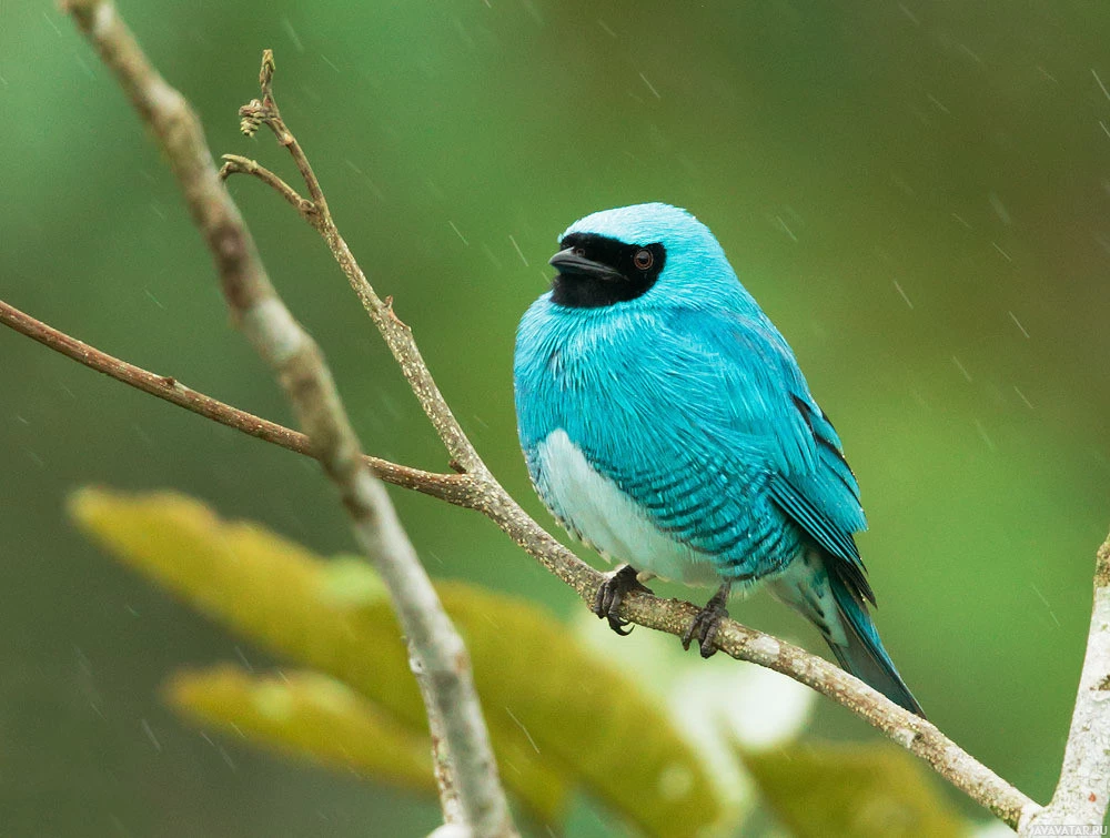 На снимке изображена синяя птица, возможно, голубая сойка или похожий вид, сидящая на ветке. Похоже, что идет дождь, о чем свидетельствуют капли, видимые на листьях и влажной поверхности растительности.