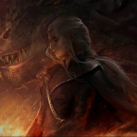 a dramatic pose with her hair flowing behind her as she gazes into the distance. A dragon, which she is known for riding in the series, is shown in the background with