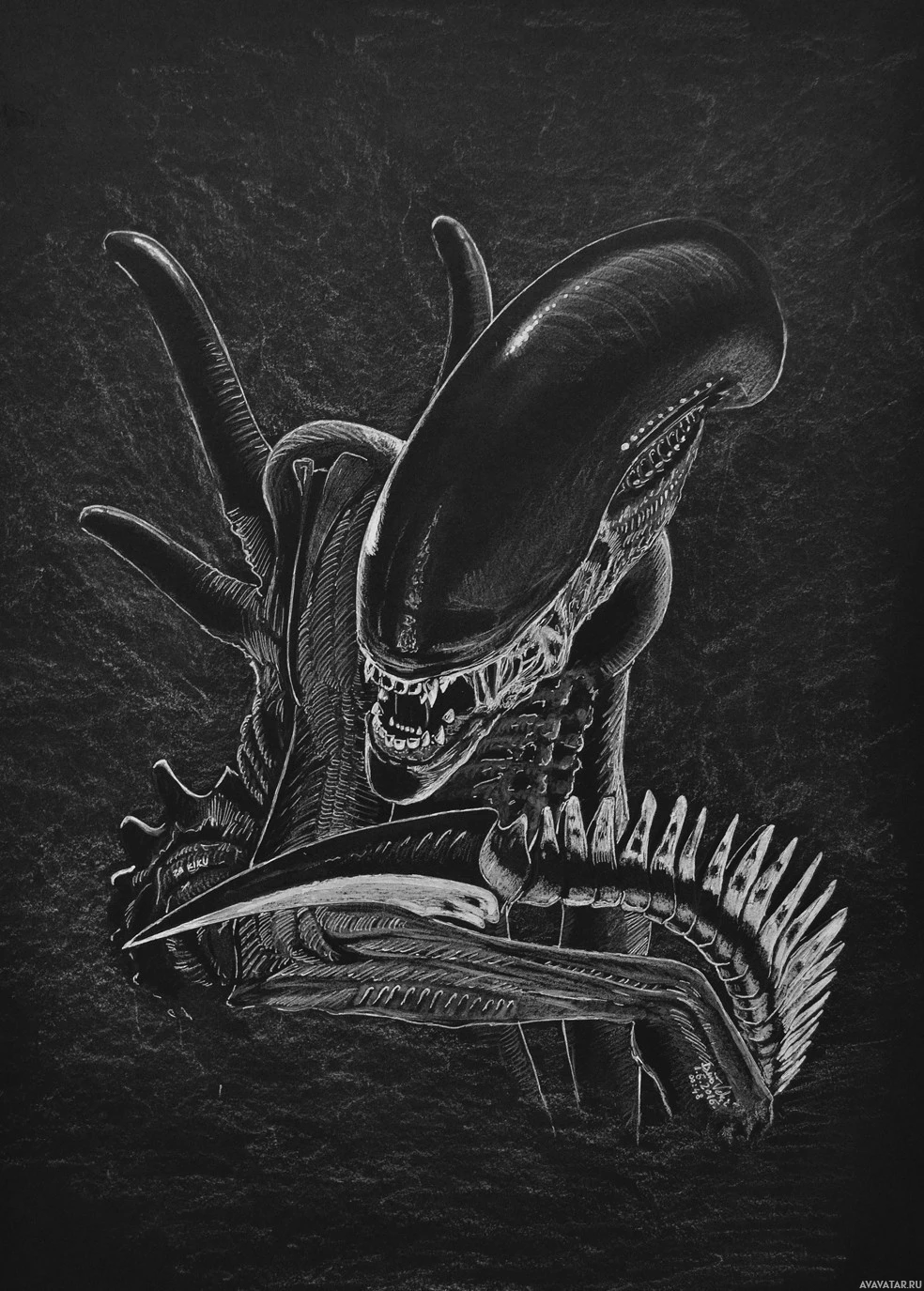 Картинка показывает иллюстрацию персонажа из франшизы фильма «Чужие». Это культовый ксеноморф, высокоразвитая форма жизни, известная своей кислой кровью и смертельными челюстями. Они являются общим антагонистом в серии фильмов.