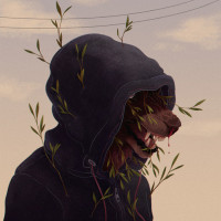 This image features a figure with the head of a wolf. The person is wearing a hooded cloak, and there are plants growing from or around their face. It appears to be an artistic representation, possibly related to fantasy themes given the anthropomorphic nature of the character's head.