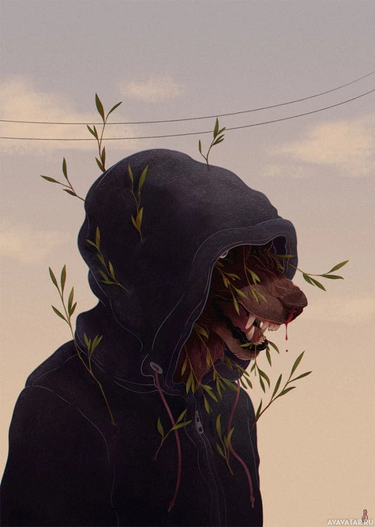На этом изображении изображена фигура с головой волка. Человек носит плащ с капюшоном, и вокруг его лица растут растения. По-видимому, это художественное представление, возможно, связанное с фэнтезийными темами, учитывая антропоморфную природу головы персонажа.