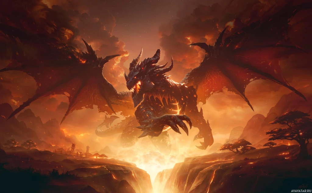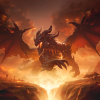 the fantasy genre, which often features dragons as part of their mythology and lore. The setting appears to be volcanic or fiery in nature, suggesting a battle or confrontation might take place within this environment.