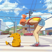 In the image, there is a character who appears to be Misty from the Pokémon franchise. She is leaning over towards a Pikachu with a concerned or affectionate expression on her face. The setting seems to be an urban street with buildings in the background under