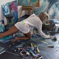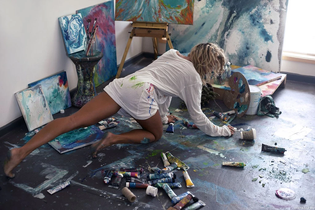 The image shows a person from behind, who appears to be engaged in painting. There is evidence of paint and art supplies around the room, indicating that they might be creating or have recently been working on