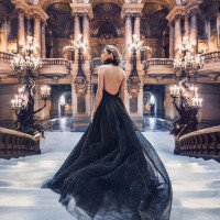 concert hall. She is wearing a long, flowing dress that reaches the floor and has a high back, suggesting it may be a formal or elegant setting. Her back is turned towards the viewer, and she seems poised as if she might be performing or presenting something. The architecture around her includes ornate columns and decorative ceiling elements, which contribute to