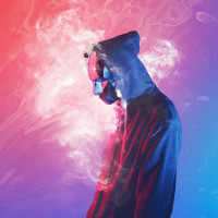 The image features a person wearing a hood and a mask. The background has a colorful, blurred effect that gives it an artistic or dynamic appearance. There is also some sort of smoke or vapor coming from the right side of the image, which adds to the dramatic effect.