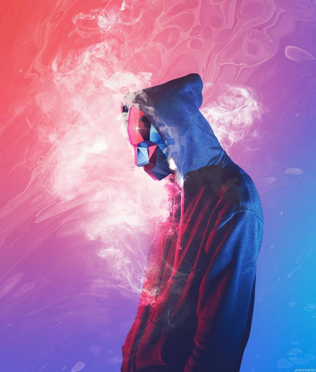 На картинке изображен человек в капюшоне и маске. Фон имеет красочный, размытый эффект, который придает ему художественный или динамический вид. Также с правой стороны изображения идет какой-то дым или пар, что добавляет драматического эффекта.