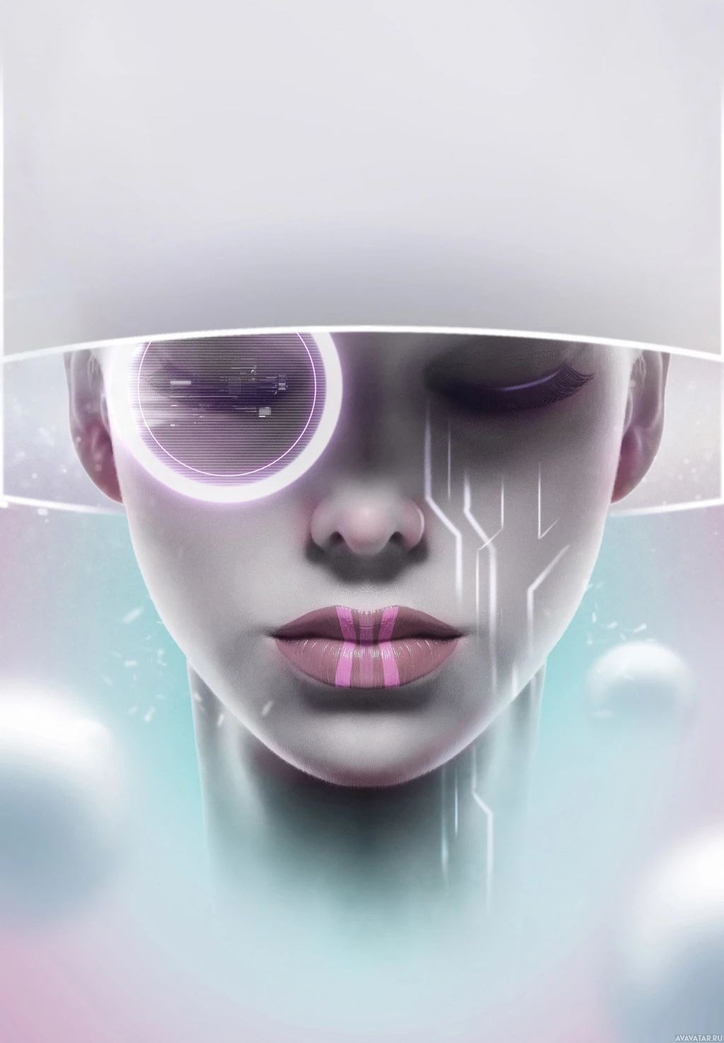 advanced technology or cybernetic enhancements, given the visible wires and mechanical elements around her face. Her skin is smooth and appears human-like, while the intricate details around her suggest a high