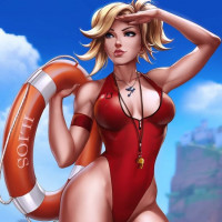 an animated character dressed in a red swimsuit, holding a lifebuoy. She is standing on what appears to be a beach or coastal setting with sand and