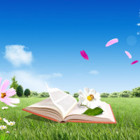 an open book lying on a grassy field with blue skies and fluffy white clouds. There are pink
