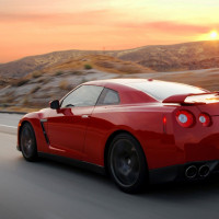 The image shows a red sports car, which appears to be a Nissan GT-R. It's captured in motion on what seems to be an open road or highway at sunset. The car is depicted with a dynamic angle, suggesting speed and performance.