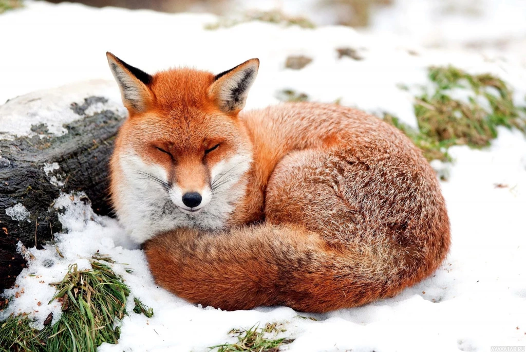 a red fox lying down in snow-covered ground. The fox is curled up, with its eyes closed as if it's resting or sleeping. It has a distinctive reddish-brown coat that blends well with