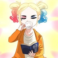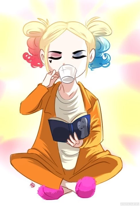 Harley Quinn, a popular comic book villain. On one side, they are holding a cup, presumably drinking from it. On the other side, they are holding