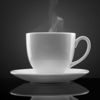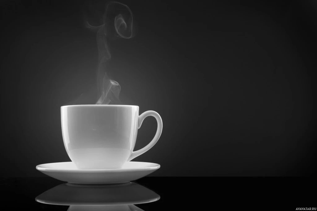 На картинке изображена чашка кофе или чая. Пар поднимается из жидкости, что указывает на то, что она горячая. Чашка и блюдце помещаются на отражающую поверхность, что добавляет визуальный эффект, показывая их отражения.