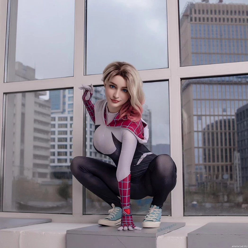 cosplay costume includes a bodysuit with the Spider-Man logo and web design, which is characteristic of Gwen Stacy's attire in her heroine alter ego, Ghost-Spider.