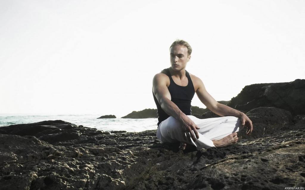 The picture shows a man sitting on rocks by the water's edge. He appears to be looking out at the sea or towards the horizon, with his hands clasped together in his lap. The background is somewhat blurry but suggests