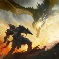 a fantasy scene with two mythical creatures: one is a dragon and the other appears to be a warrior or knight. They are set against