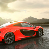 The image shows a red sports car, likely an Aston Martin DB7. It's parked on a road with mountainous terrain in the background during what appears to be either sunrise or sunset given the warm lighting.