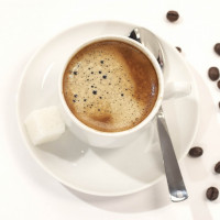 The picture shows a cup of coffee with cream, accompanied by coffee beans and sugar cubes. The image also includes a spoon and is set against a white background, which is typical for a presentation or advertisement related to coffee.