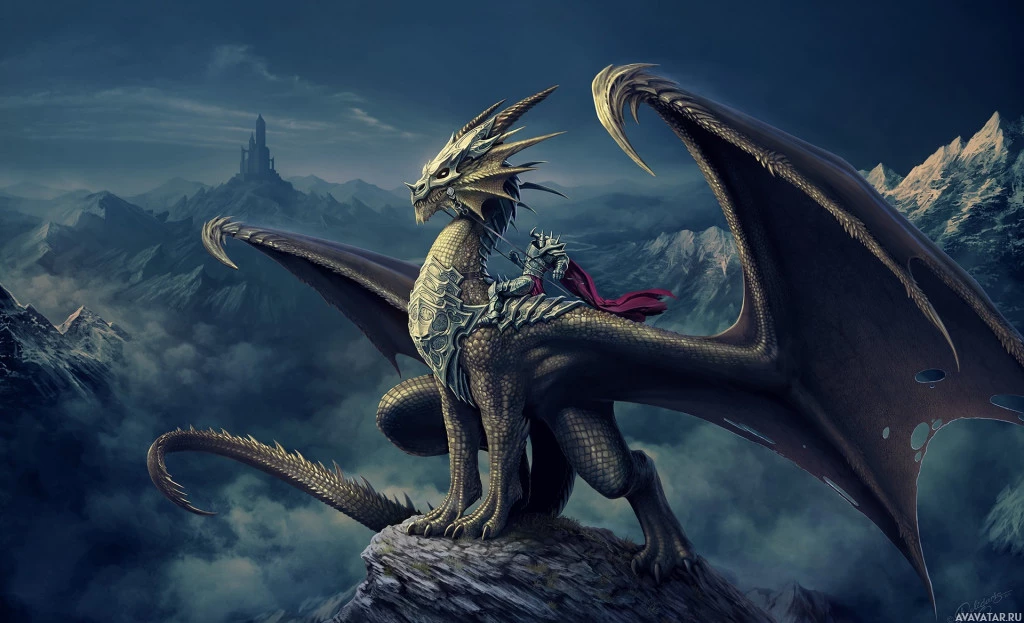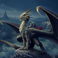 The image depicts a fantasy-themed scene featuring a dragon. The dragon is shown perched atop a mountain, with a majestic and somewhat regal appearance. It has