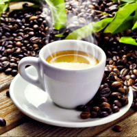 green leaves that could be related to coffee or simply added for decoration. The overall scene suggests a setting focused on enjoying