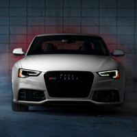 The image shows a silver Audi RS 5 Sportback car positioned against a backdrop that appears to be an industrial or urban setting, possibly with some mist or vapor effect on the background due to the angle and lighting. The car is in focus with its design elements highlighted, such as the grille with the four rings logo, the LED headlights, and the large