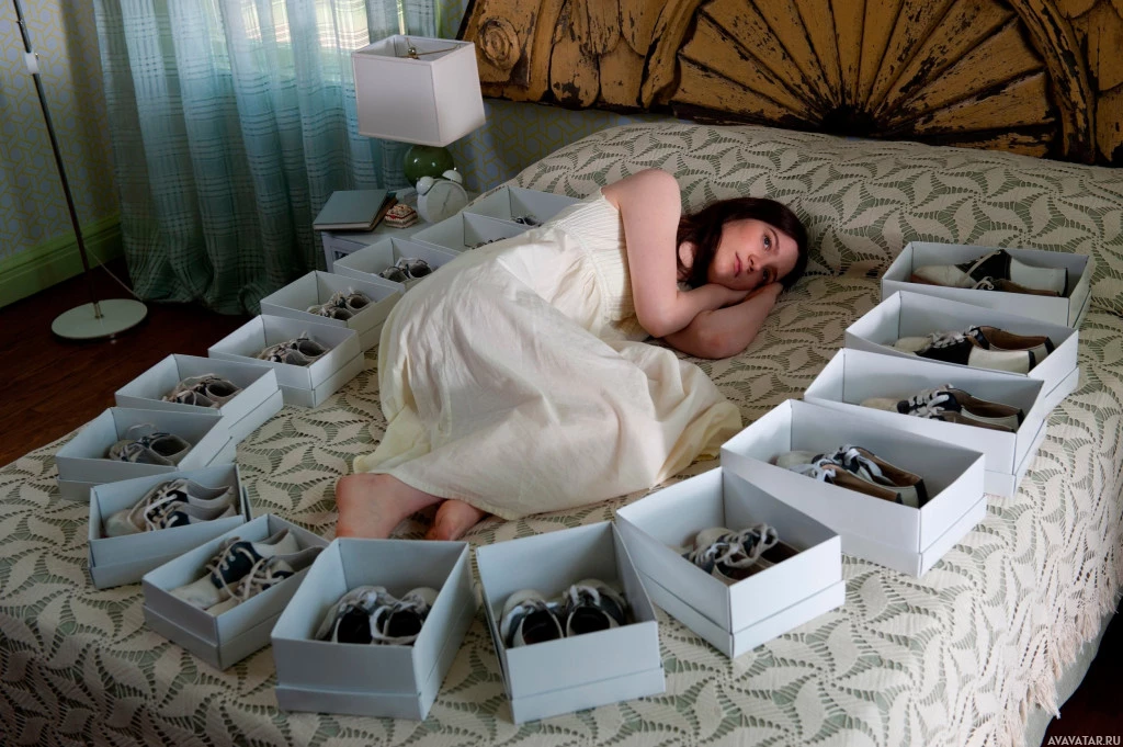 a different type of shoe, suggesting that she might be organizing or trying out various shoes for an event or photoshoot. She is dressed in a white garment and has