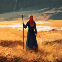 red hair, standing in front of a large rock formation. She is wearing a dress that could be described as