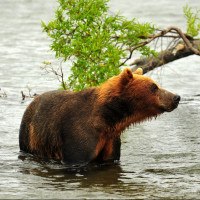a body of water, which appears to be a river or stream. The bear is partially submerged up to its midsection, and it's facing towards the right side of the photo. The background includes trees and foliage, suggesting that this scene takes place in a natural, possibly