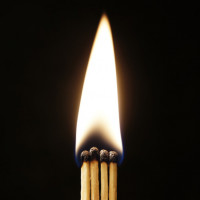 На картинке показан один освещенный матч и два неосвещенных матча, расположенных поверх кучи неосвещенных спичек. Фон темный, создавая резкий контраст с ярким пламенем освещенного матча.