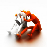 The image shows a 3D rendering of three human-like figures that appear to be huddled together, possibly in a pose that could suggest comfort or support for one another. They have a simplistic design with minimal detail, and their colors are limited to shades of orange and red against