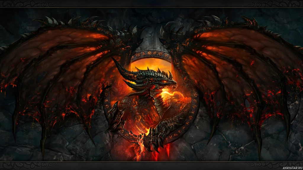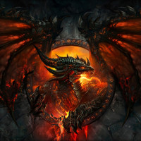 red wings and appears to be either in the process of attacking or preparing to do so. In front of the dragon are several smaller creatures that seem to be either defending against the dragon's attack or being consumed by it. The background is dark with a red glow emanating from a circular object in the middle, which could represent a source of power or a dangerous artifact within this