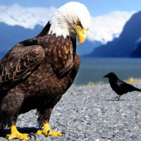 a body of water and a mountainous landscape, suggesting this might be a scene from a mountainous region, possibly near a lake or river. The eagle seems to be observing the bird with interest, as indicated by their posture. This image is commonly associated with the wildlife found in regions like Alaska, where bald eagles and various other