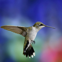 Картинка показывает колибри в полете. Он имеет типичные небольшие размеры, переливающиеся перья и длинный клюв, характерные для этого вида. Птица захвачена в середине полета на фоне, который, кажется, имеет некоторые красочные элементы, возможно, цветы или растения.