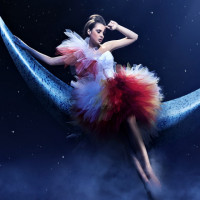 a crescent moon with her hand, suggesting she might be dancing or performing an act related to space or astronomy. The background includes stars, giving a sense of being in