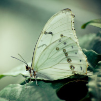 The image shows a close-up of a butterfly perched on a leaf. The background is blurred, likely to focus attention on the butterfly, and it appears to be in a natural setting with greenery.