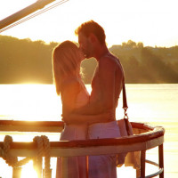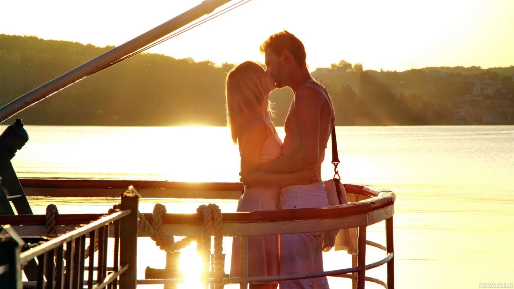 an intimate moment. They are standing close together, possibly on the bow of a boat or docking area by water. The sun is setting, casting