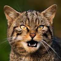На снимке изображена дикая кошка, которая кажется евразийской рысью, стоящей с густым хвостом и настороженными глазами. Кошка, кажется, захвачена в середине вокализации или, возможно, делает звонок. Его выражение лица предполагает, что он может проявлять признаки волнения или волнения.