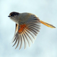 The image shows a small bird in flight. It has grey and white plumage, with visible wingfeathers that display a mix of dark and light colors. This could suggest it's a species known for its distinctive wing patterns or markings.